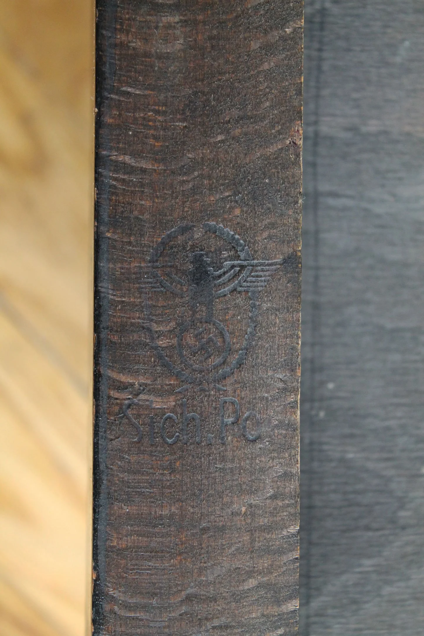 Another significant and sobering detail about the history of this chair is the small German Eagle and swastika mark that can be seen on the underside of the seat. If this owner’s mark wasn’t scary enough, there are two words engraved; ‘Sich.Pol’ which means Sicherheitspolizei also known as Sipo. This was an elite unit of Nazi Secret Police the predecessor of ghastly Gestapo.